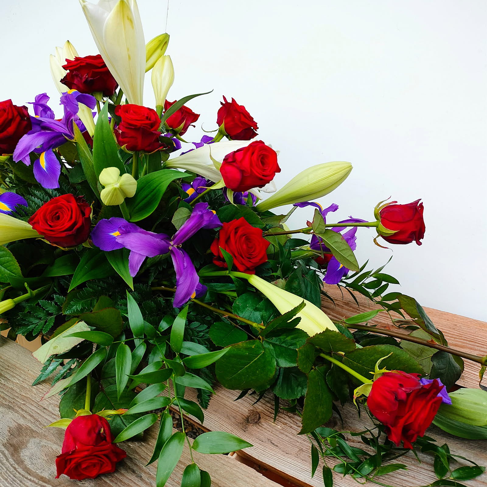 Hos Hinnerup Blomster binder vi bårebuketter, laver kistepynt og båredekorationer og kranse lige efter dit ønske. Bestil i vores webshop – gratis levering til lokale begravelser.