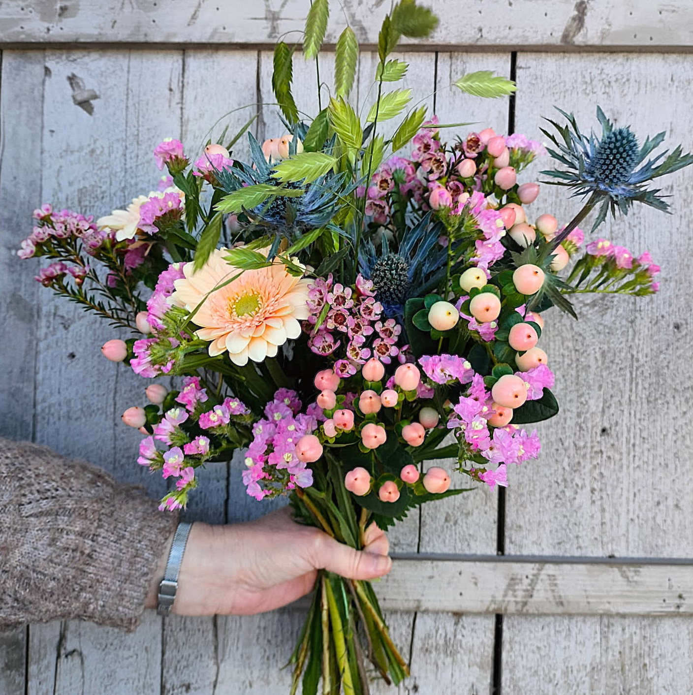 En smuk buket i pastel farver, variere efter årstidens blomster.